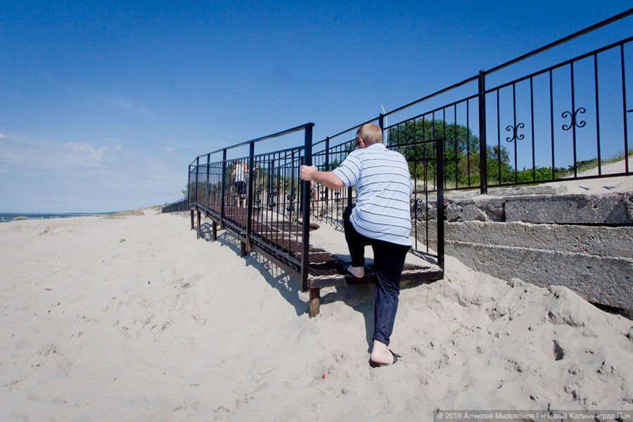 Пандус для инвалидов, которым оборудован реконструированный променад на пляже в Балтийске, оказался недоступным для колясочников. Как передаёт корреспондент «Нового Калининграда.Ru», пандус обрывается примерно в 20-30 см (в зависимости от силы ветра) над уровнем пляжа.