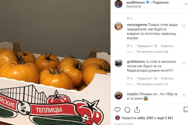 Глава региона описал фотографию с желтыми помидорами с помощью хэштегов, которые свидетельствуют о том, что овощи были выращены на предприятии из Гвардейска «Орбита-Агро». В комментариях подписчики чиновника выразили недовольство высокой стоимостью этих помидоров. По словам некоторых, она доходит до 180 рублей за килограмм.