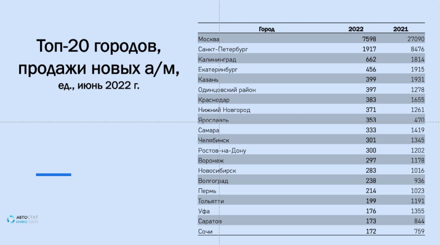 При этом Калининград занял третье место в топ-20 городов по продаже новых автомобилей в июне текущего года. Рейтинг возглавила Москва, где с июня прошлого года продажи легковых машин сократились с 27 090 до 7 598 автомобилей. Второе место у Санкт-Петербурга — 1 917 авто (годом ранее — 8 476).