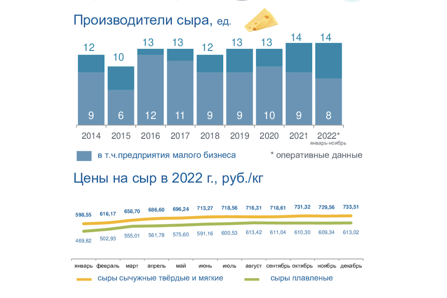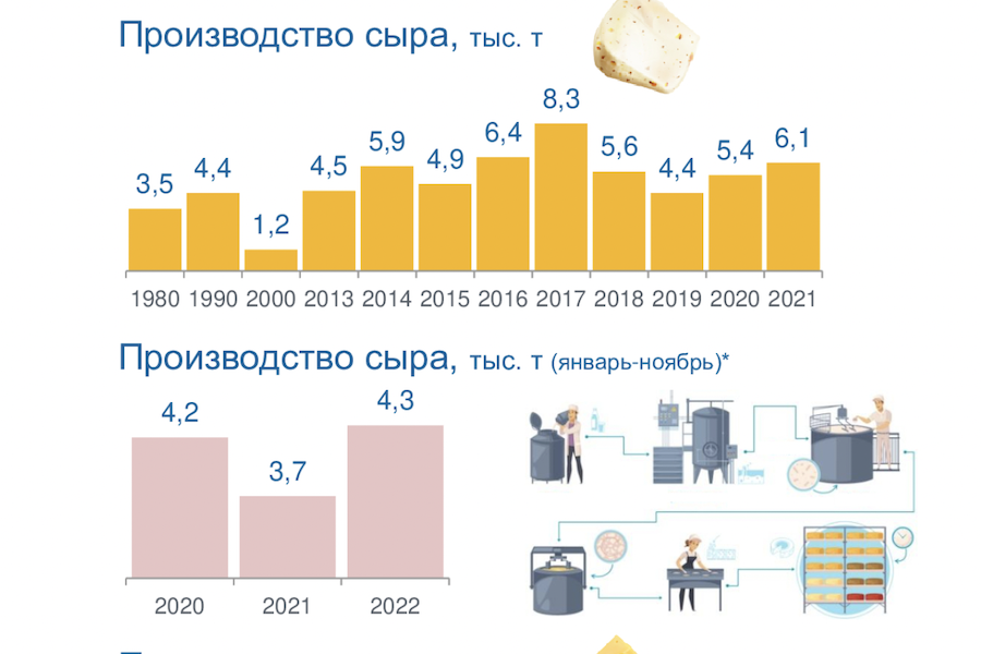 Производство сыра на территории Калининградской области растет с 2018 года и в 2021 году составило 6,1 тыс. тонн в год. Однако это на 26,5% меньше, чем в пиковый по объемам производства 2017-й, когда на территории области произвели 8,3 тыс. тонн сыров. Полных данных за 2022 год пока нет, но за период с января по ноябрь калининградские сыроделы произвели 4,3 тыс. тонн сыра, для сравнения в 2020 году за этот же период — 4,2 тыс. тонн, в 2021 году — 3,7 тыс. тонн. Таким образом, можно надеяться на сохранение тенденции к росту объемов производства.
