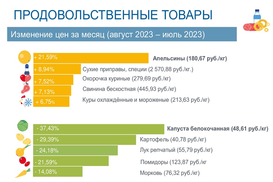 В августе, по сравнению с июлем, наиболее значительным стало снижение цен на белокочанную капусту, подешевевшую на 37,43%. Цена на картофель снизилась на 29,39%, на репчатый лук — на 24,18%. Помидоры стали дешевле на 21,59 %, морковь — на 14,08%.В июне самыми подорожавшими в месячном выражении продуктами были картофель, морковь и свекла.