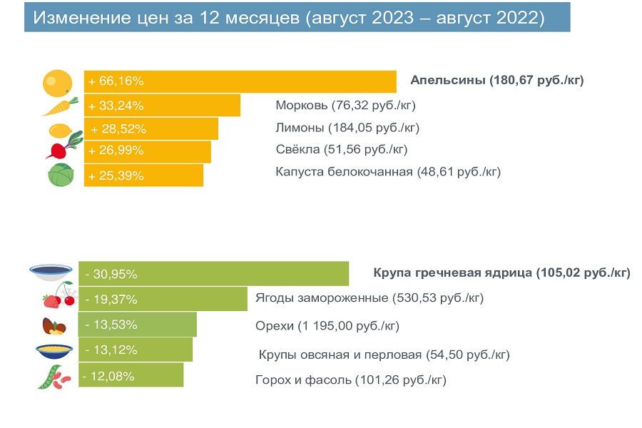 В списке продуктов, ставших в августе 2023 года дешевле по сравнению с аналогичным месяцем 2022 года, на первом месте гречневая крупа (-30,95%), на втором — замороженные ягоды (-19,37%), на третьем — орехи (-13,53%), овсяная и перловые крупы на четвёртом (-13,12%). Замыкают пятёрку горох и фасоль (-12,08%).