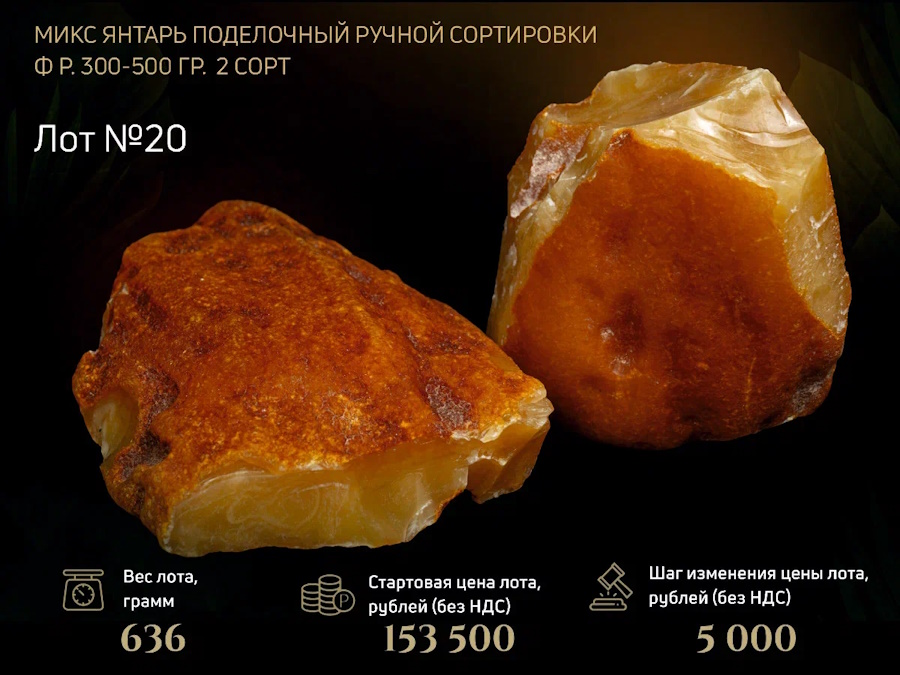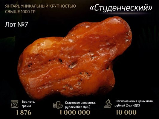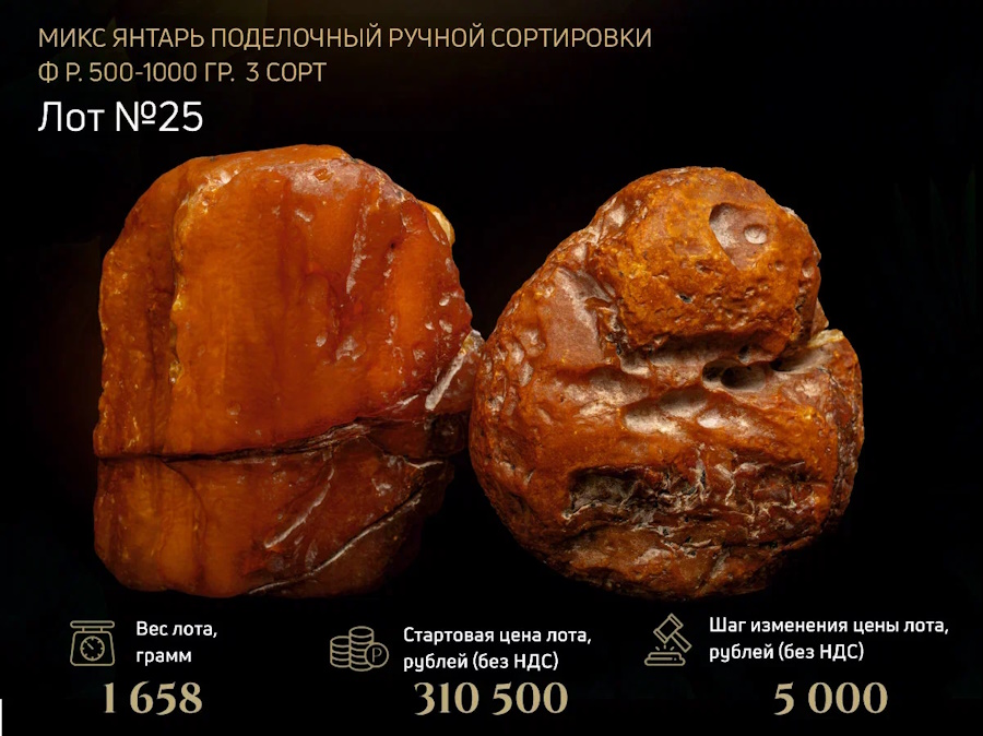 «Вес аукционных самородков от 1026 до 1876 гр. Самый тяжелый камень — прошлогодний „Студенческий“ — весит 1876 граммов. Его начальная стоимость составляет 1 млн рублей. Самый легкий — 1026 граммов. Этот самородок безымянный — он был добыт в 2010 году, когда традиции называть уникальные образцы янтаря в честь знаменательных дат и событий на комбинате еще не существовало. Стартовая цена самого маленького камня 500 тысяч рублей. Шаг аукциона составит 10 тысяч рублей», — сообщил руководитель службы реализации янтарного сырья Калининградского янтарного комбината Максим Ломакин.