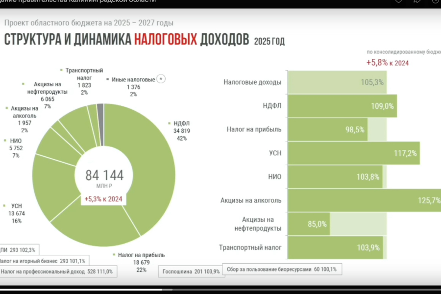 Министерство финансов Калининградской области заложило в проект бюджета региона на 2025 год рост поступлений от НДФЛ, упрощённой системы налогообложения и акцизов на алкоголь. Об этом на заседании правительства сообщил министр финансов региона Виктор Порембский, представляя трёхлетний проект бюджета.