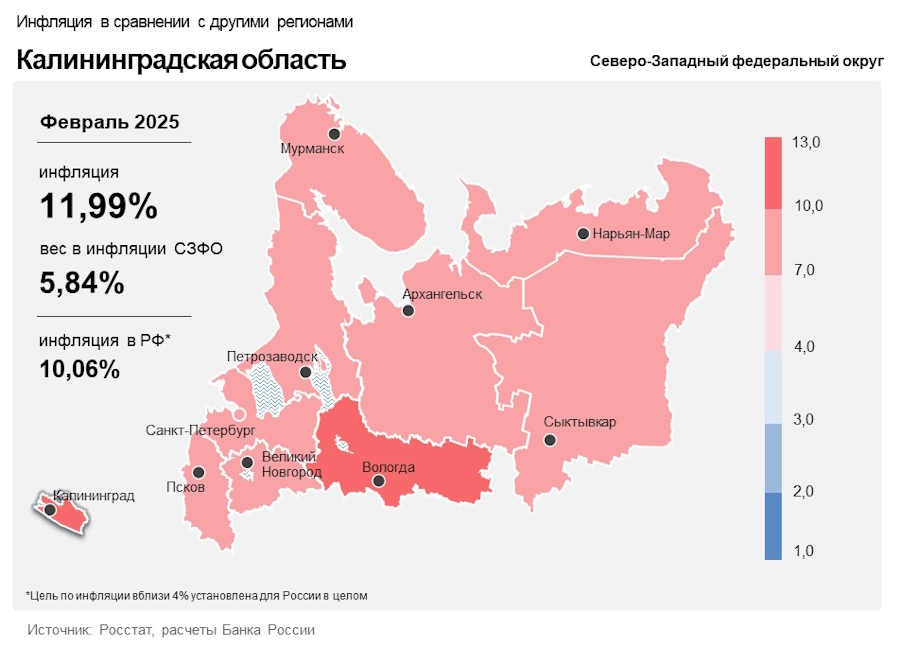 По данным Росстата, годовая инфляция в Калининградской области в феврале 2025 года увеличилась до 12%. В Центробанке это связывают с ростом затрат производителей некоторых продуктов и поставщиков услуг, а также с повышением спроса на отдельные услуги.