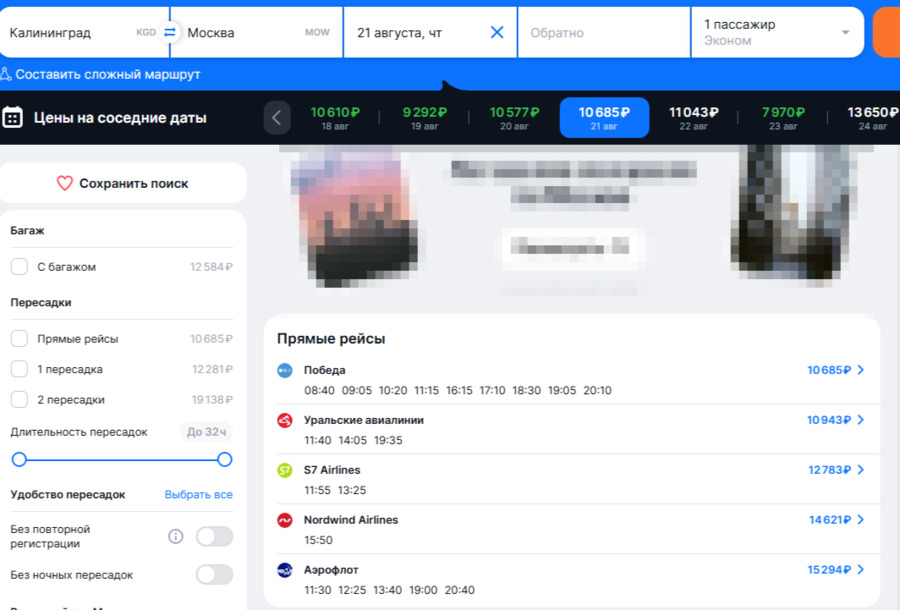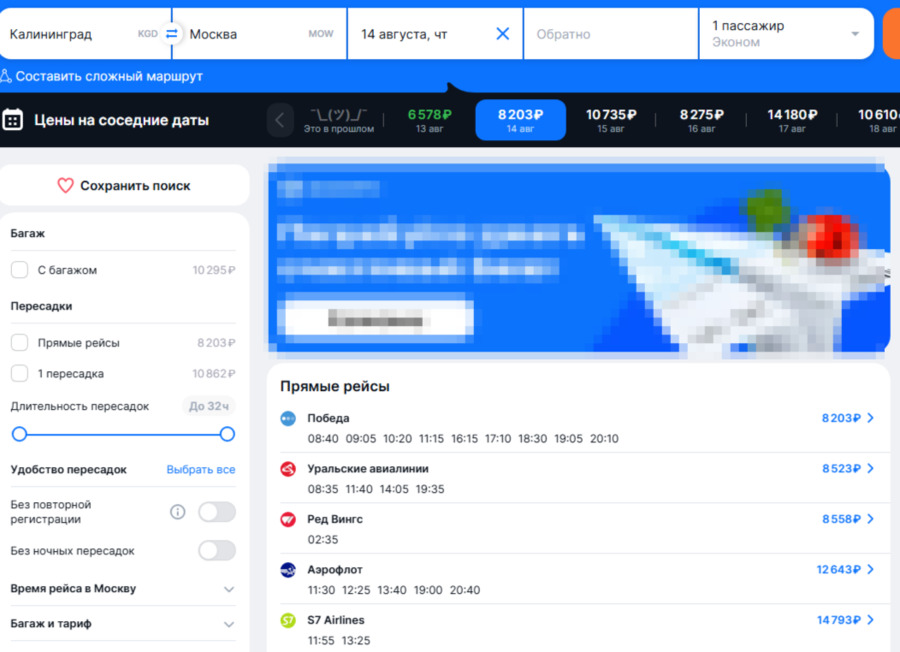 По данным агрегатора «Авиасейлс», на ближайшую неделю (с 14 по 21 августа) билеты до Москвы начинаются от 8 тыс. руб. (без багажа) в один конец, с 21 по 28 августа — от 12 тыс. руб., авиакомпания «Аэрофлот» , которая ранее вводила «плоские» тарифы для Калининграда, в настоящее время продает билеты из Калининграда в Москву по 12-15 тыс. руб. в один конец. На официальные запросы СМИ авиакомпания не отвечает.