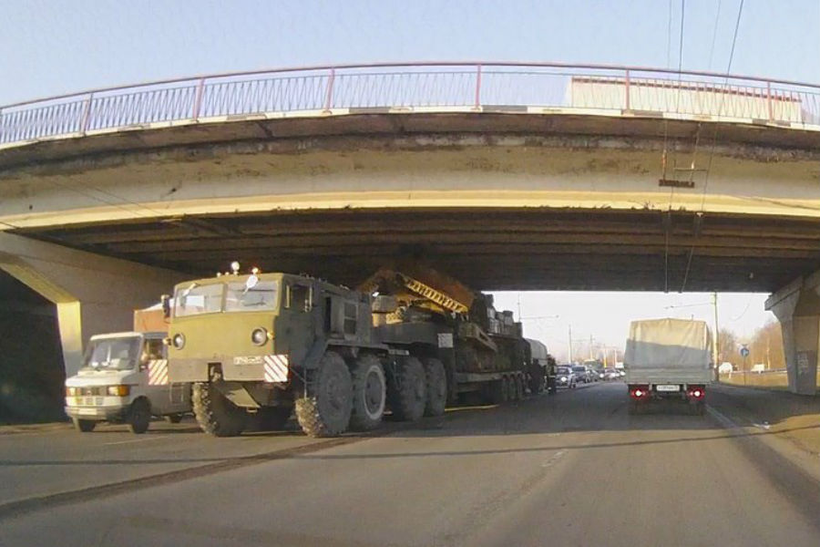 Под путепроводом на выезде из областного центра застрял тягач с военной техникой. Об этом в среду сообщают участники сообщества калининградских автомобилистов «ВКонтакте». По данным автолюбителей, груженый транспорт не смог пройти под мостом на Советском проспекте.