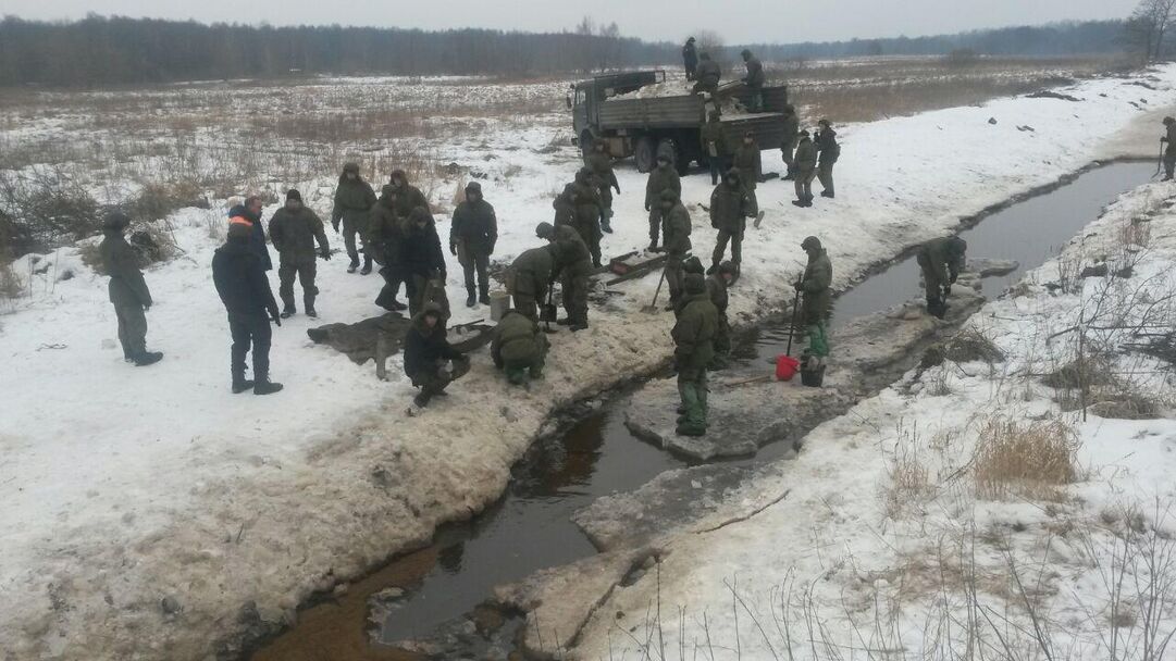 Сигнал поступил от местных жителей, которые обратили внимание на загрязнение ручья в районе воинской части жидкостью со специфическим запахом. По предварительным данным, на территории, принадлежащей Минообороны, произошла утечка дизельного топлива. Сейчас на месте разлива уже работают военные. Для того чтобы нефтепродукты по ручью не ушли в другой водоем, выставлены защитные буны.
