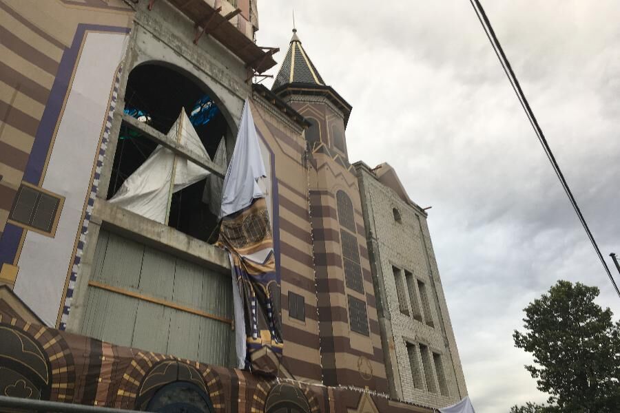 Недостроенную часть будущей синагоги на острове Октябрьском закрыли баннером 12 июня.