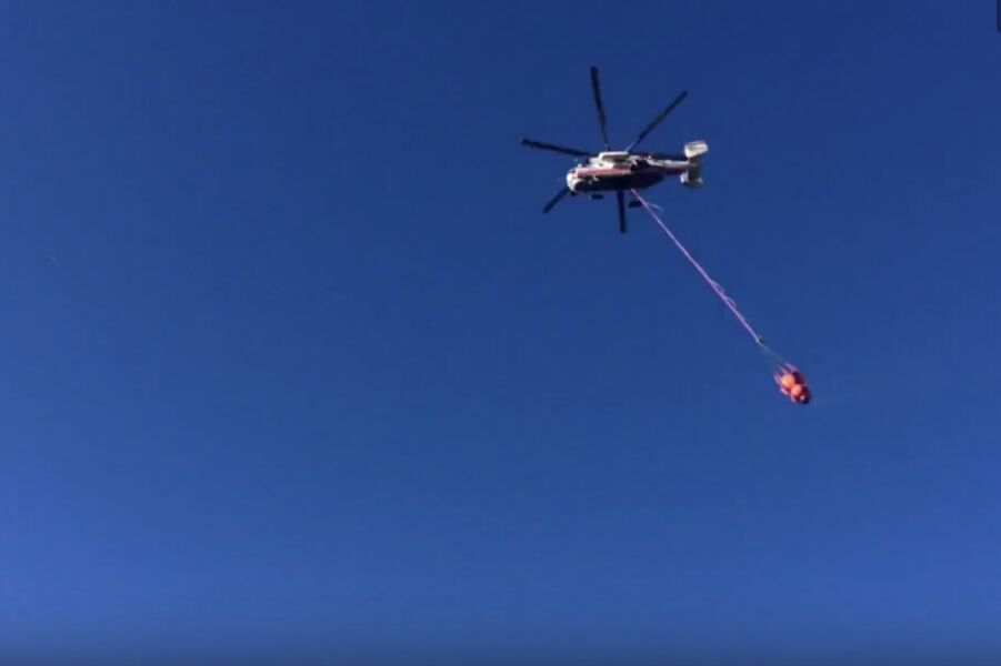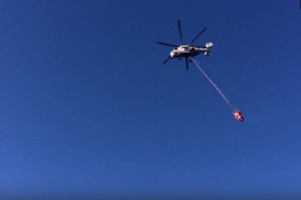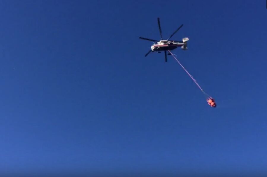 В Советске продолжают бороться с огнем на складах бывшего ЦБЗ. Кадры тушения пожара с помощью вертолета-КА-32 появились в соцсетях.
