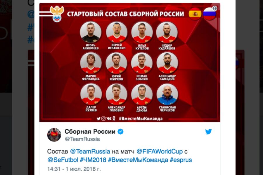 Тренерский штаб сборной России по футболу определился со стартовым составом команды на матч 1/8 финала чемпионата