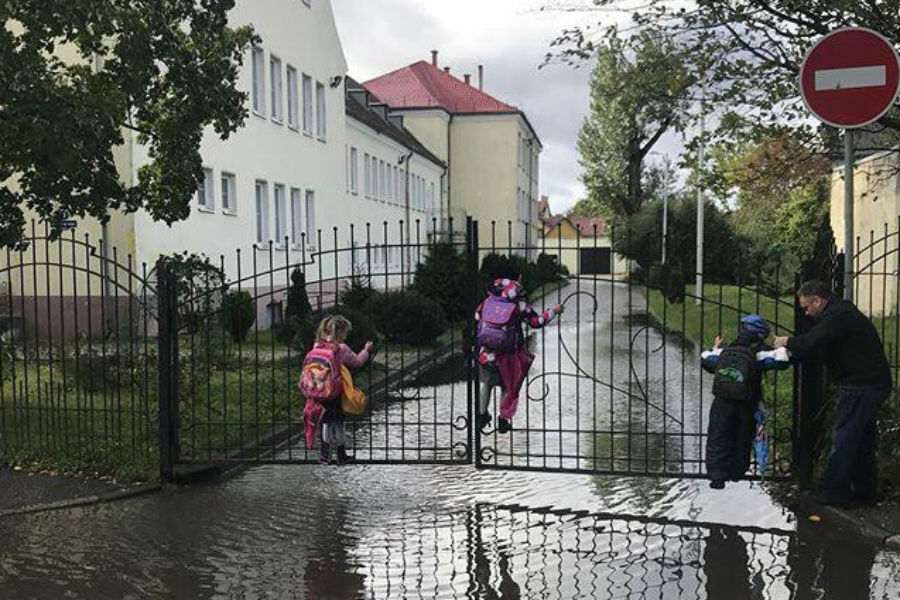 В школу № 8 на Северной горе детям приходится пробираться по забору или вброд по затопленной улице