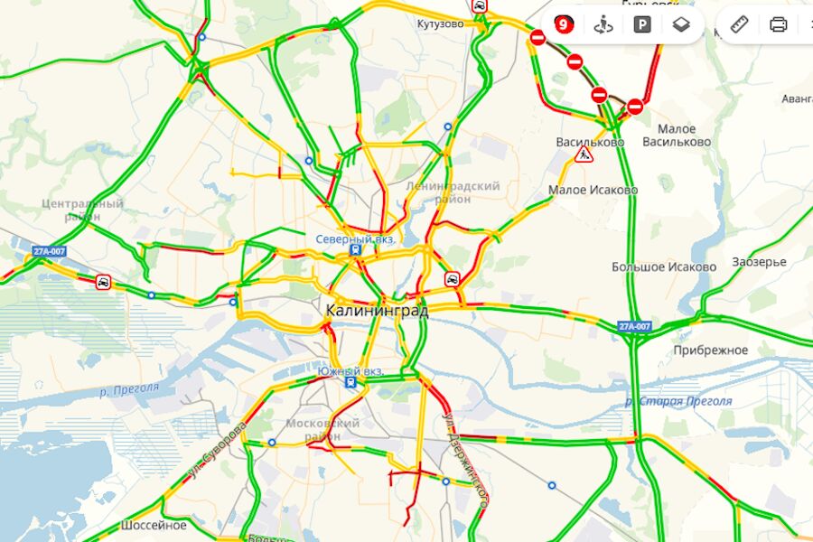 Сервис показывает в городе пробки в 9 баллов и 4 аварии — на Литовском валу, проспекте Победы, В начале Приморского кольца и на ул. Краснокаменной.