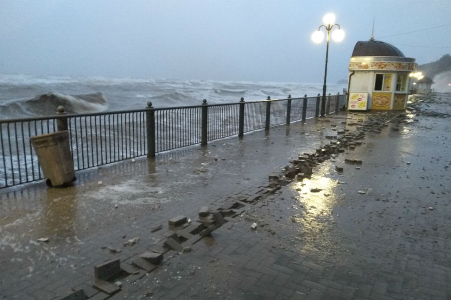 В Светлогорске шторм повредил старый променад в районе отеля «Гранд палас", сообщают очевидцы. Частично разрушено покрытие променада, сквозь щели бьют волны, вокруг разбросана повреждённая плитка. Видеокамеры правительства на стройплощадке нового променада не работают.