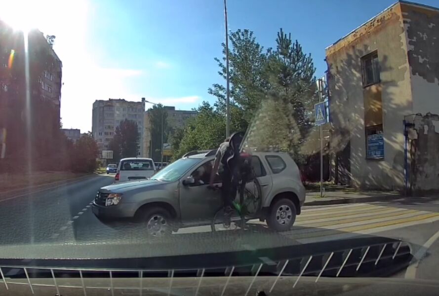 В Калининграде на ул. Генерала Челнокова велосипедист врезался в автомобиль. Видео происшествия опубликовано в сообществе калининградских автомобилистов в «ВКонтакте».