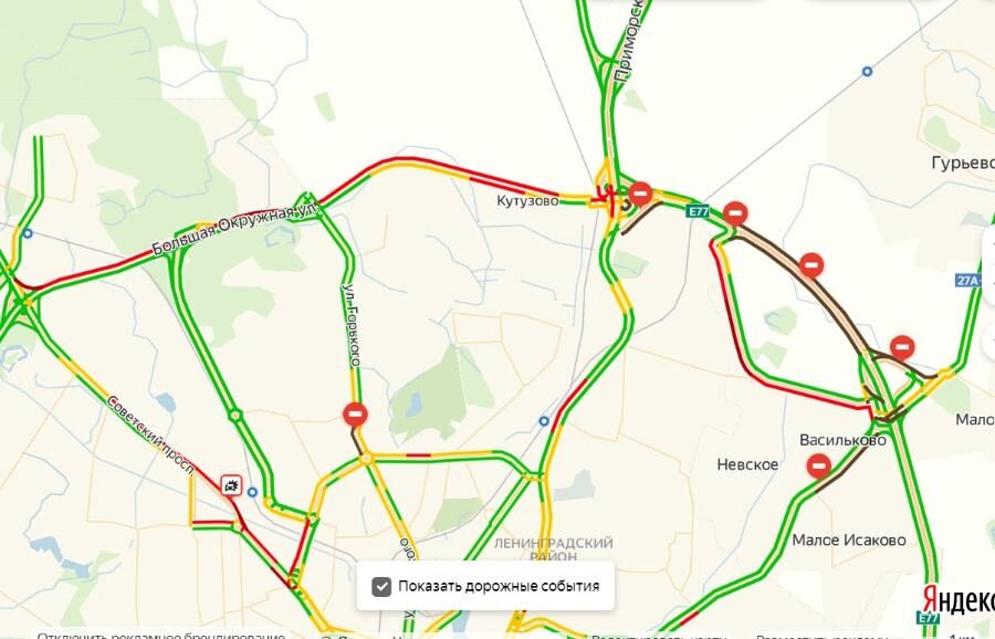 В Калининграде в субботу на улице Большой Окружной образовалась пробка от Советского проспекта до поселка Васильково. Об этом свидетельствует сервис «Яндекс. Пробки».