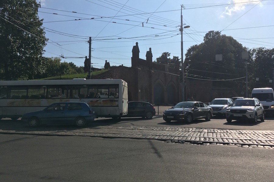 Возле Фридландских ворот на пересечении с ул. Дзержинского столкнулись рейсовый автобус № 10 и легковое авто. Участники аварии перекрыли трамвайные пути.