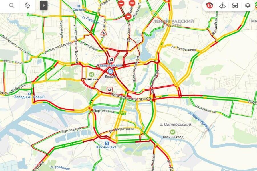 Калининград во вторник вечером «встал» в 10-балльных пробках — это наивысший балл в шкале заторов. По данным специализированного сервиса «Яндекса», масштабные пробки образовались как в центре города, так и на других больших магистралях.