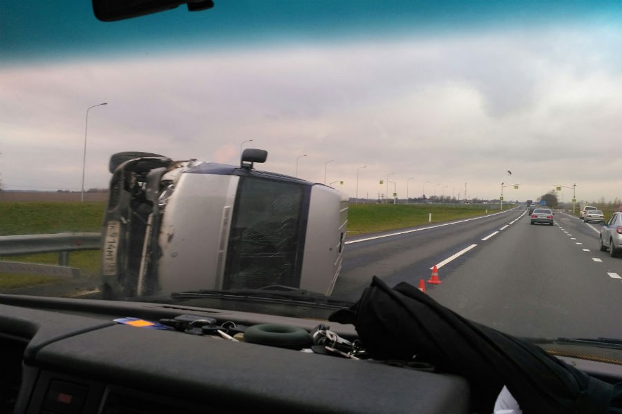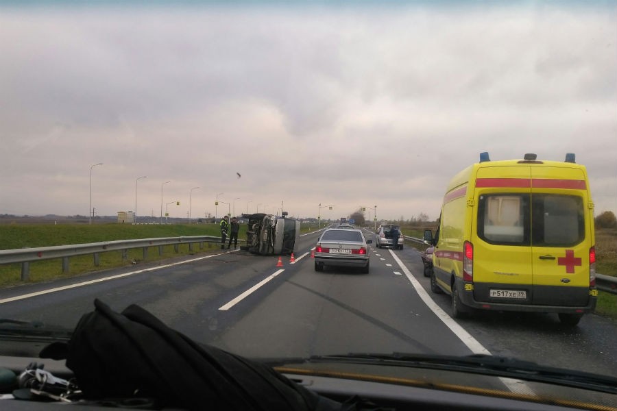 Дорожная авария случилась недалеко от перекрестка с дорогой, ведущей к пос. Сокольники, оба столкнувшихся автомобиля двигались в сторону Калининграда. В результате ДТП микроавтобус опрокинулся.