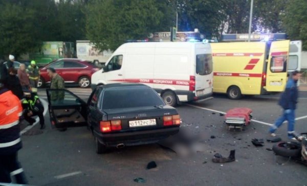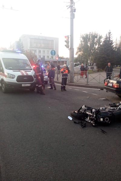 Водитель легкового авто госпитализирован. По словам некоторых очевидцев, на пассажирском сидении мотоцикла находилась девушка, её якобы также увезли в больницу.