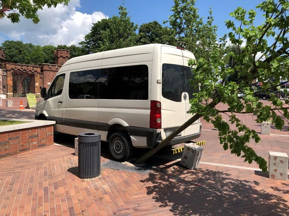 На реконструированной улице Баранова в Калининграде водитель микроавтобуса при движении задним ходом наехал на дерево. Как сообщают очевидцы, инцидент произошёл в четверг, 25 июня, в районе башни Врангеля, где находится платная парковка.