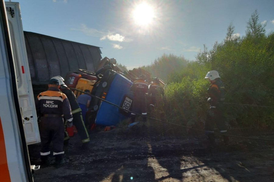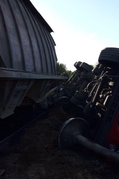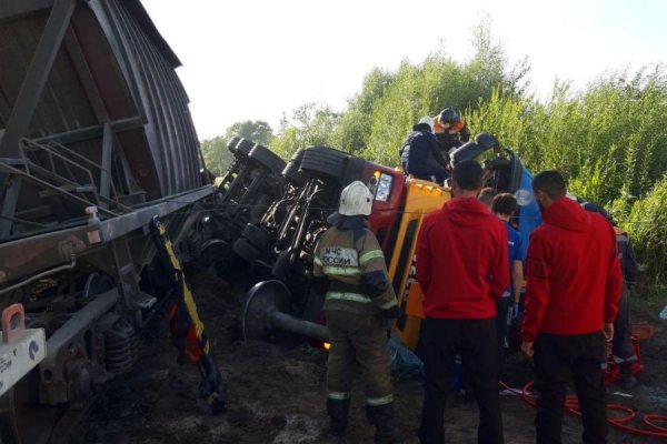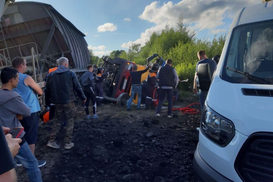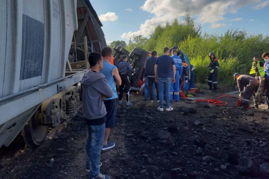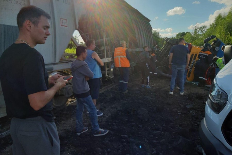 По словам очевидца, тепловоз был в конце состава и толкал вагоны с углем, перевернулись первые два вагона. Как объяснил машинист, слова которого слышал очевидец, водитель грузовика решил «проскочить». В результате ДТП грузовик с песком перевернулся, кабина заблокирована. Водителя пытаются достать спасатели. Помимо них, на месте находятся сотрудники ГИБДД, пожарные, скорая помощь. Водитель, по словам очевидца, жив.