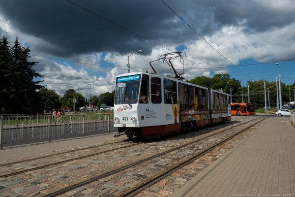 В Калининграде на проспекте Мира трамвай врезался в автомобиль такси, который остановился на рельсах. Видео инцидента опубликовано в паблике «Типичный Калининград».