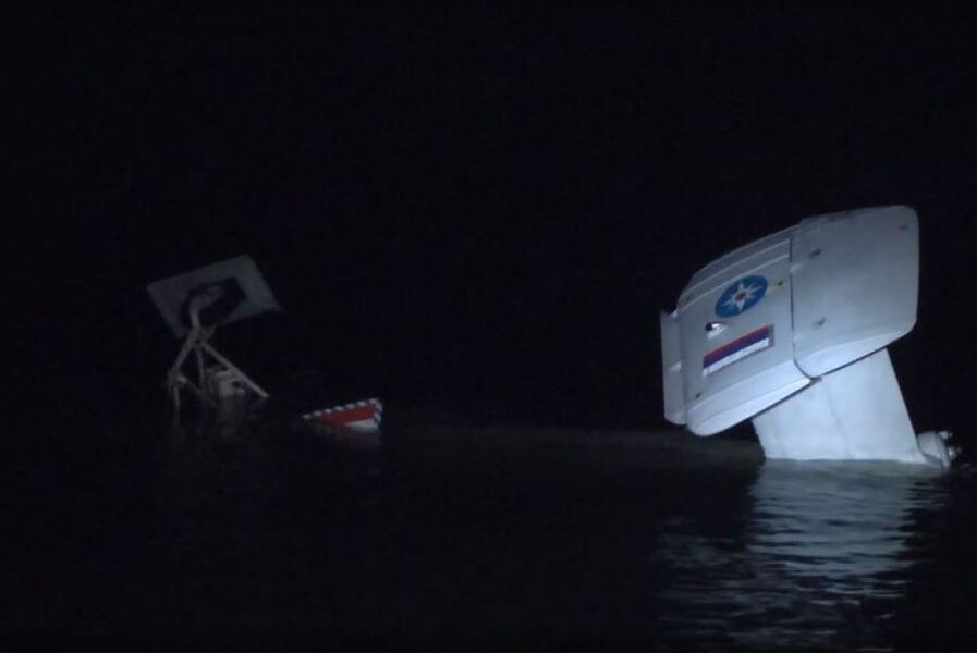 Судя по видеокадрам, вертолет скрылся под водой не полностью, видно одно из шасси. Сотрудники МЧС подтверждают, что глубина в месте падения составляет около 4-5 метров. При падении машина получила повреждения: «Вон он весь раскорежен», — комментирует за кадром один из участников спасательной операции.