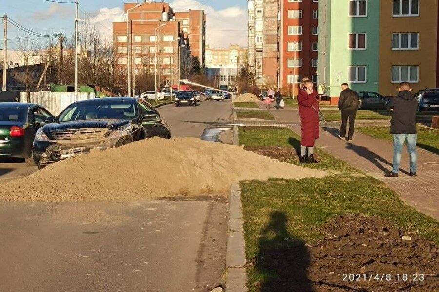ДТП случилось в дворовом проезде, от удара автомобиль получил повреждения. На фотографии видно еще одну кучу песка, высыпанную в отдалении на газон.