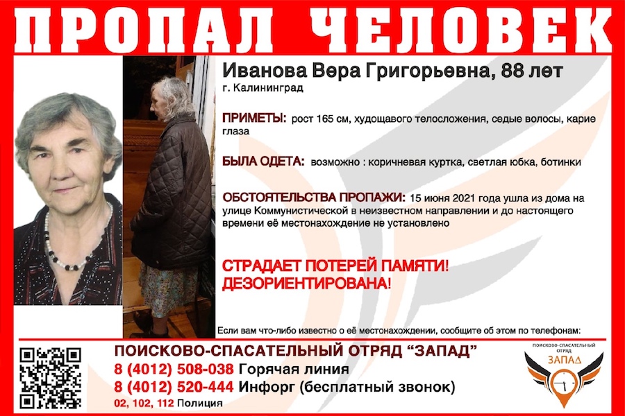 В Калининграде разыскивают 88-летнюю Веру Иванову, попавшую две недели назад. Об этом корреспонденту «Нового Калининграда» в среду, 30 июня, сообщили в ПСО «Запад».