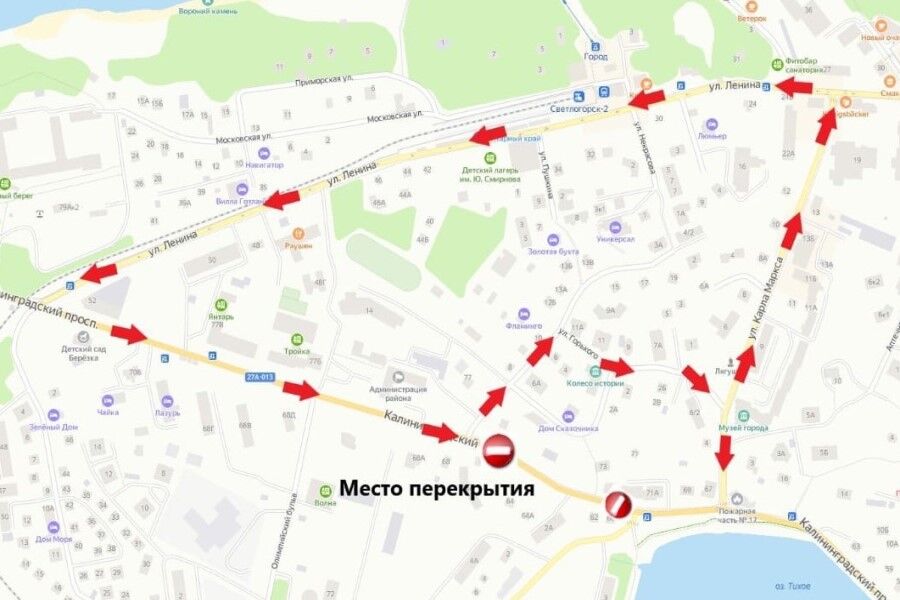 Объезд при движении к центру Светлогорска со стороны Тихого озера организован по ул. Карла Маркса, в обратном направлении — по ул. Горького и Карла Маркса. Сколько продлятся работы по восстановлению дороги, местные власти прогнозировать не берутся. Информацию об отмене ограничения обещают разместить в соцсетях.