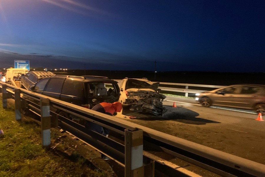 ДТП произошло в пятницу в 18:10. У «Фольксвагена» на 31 километре дороги спустило колесо, для того, чтобы ему помочь, остановился 43-летний водитель «Тойоты» и вышел на проезжую часть. Их вовремя не заметила 33-летний водитель «Хендэ»: не успев перестроиться, она не справилась с управлением и врезалась в «Тойоту», которую отбросило от удара на «Фольксваген», сбив водителя «Тойоты». Он и водитель «Хендэ» доставлены в больницу.