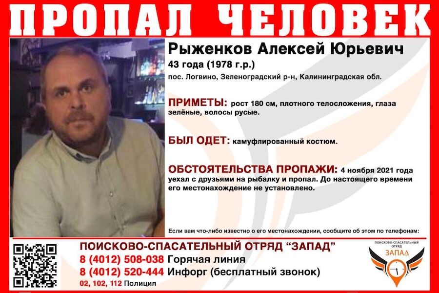 В Зеленоградском районе полиция, родственники и волонтеры разыскивают 43-летнего Алексея Рыженкова, который пропал еще 4 ноября. Об этом корреспонденту «Нового Калининграда» сообщили в ПСО «Запад».
