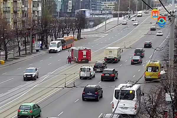 В Калининграде пожарный расчет перекрыл половину шестиполосного Ленинского проспекта, чтобы пенсионерка смогла перейти дорогу. Инцидент попал на камеры «Безопасного города».