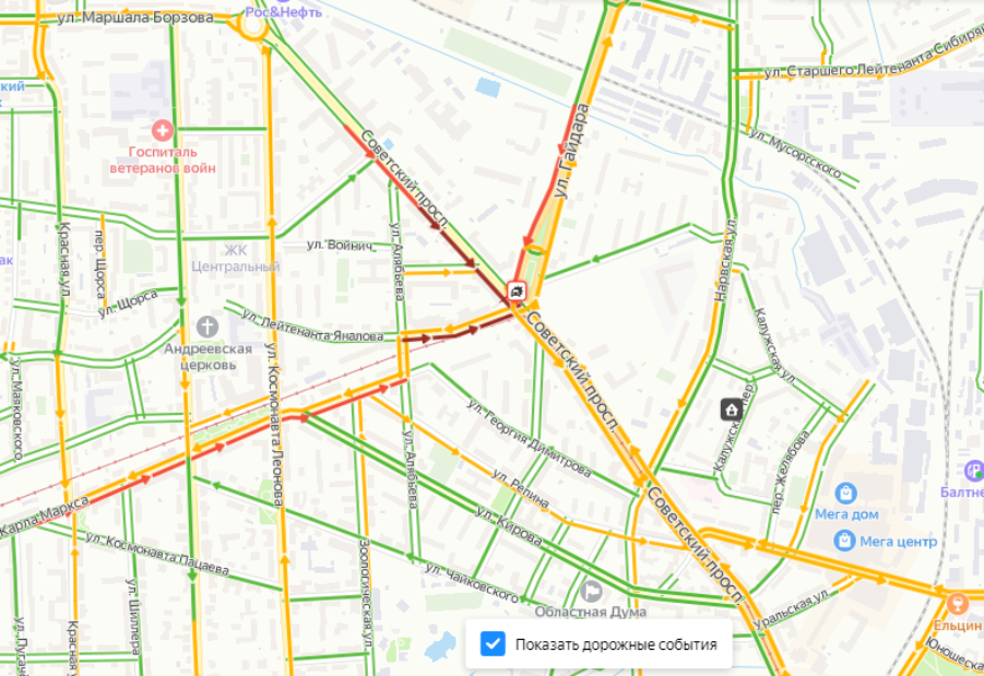 В Калининграде на пересечении Советского проспекта, улиц Гайдара и лейтенанта Яналова столкнулись три автомобиля, из-за чего движение в этом месте сильно осложнилось. Об аварии в среду, 15 декабря, «Новому Калининграду» сообщил очевидец.