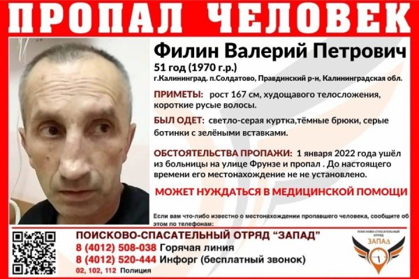 В Калининградской области ищут пропавшего 51-летнего Валерия Филина. Как сообщают в ПСО «Запад», житель пос. Солдатово под Правдинском 1 января вышел из больницы на ул. Фрунзе в Калининграде и пропал. Он может нуждаться в медицинской помощи.