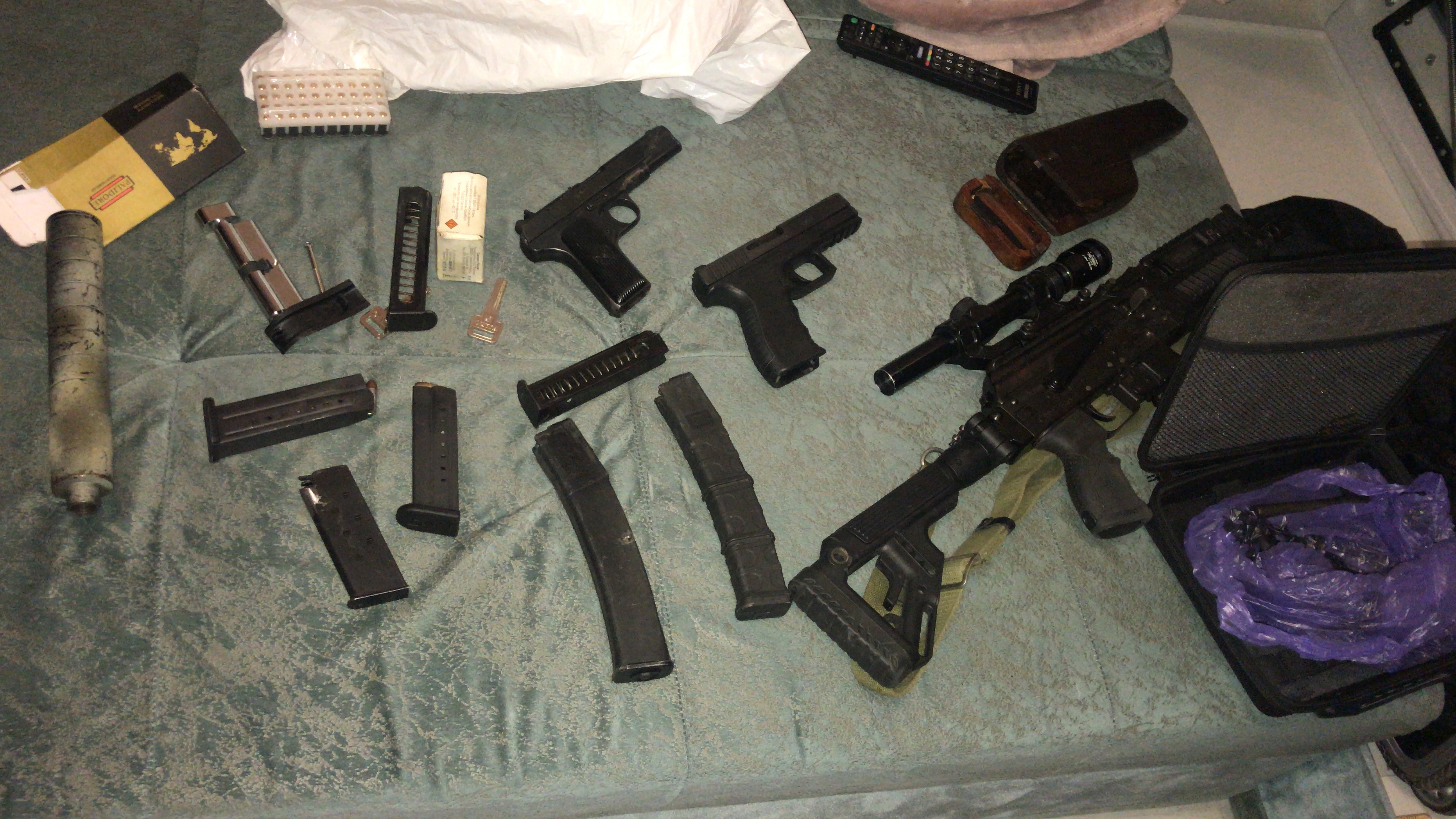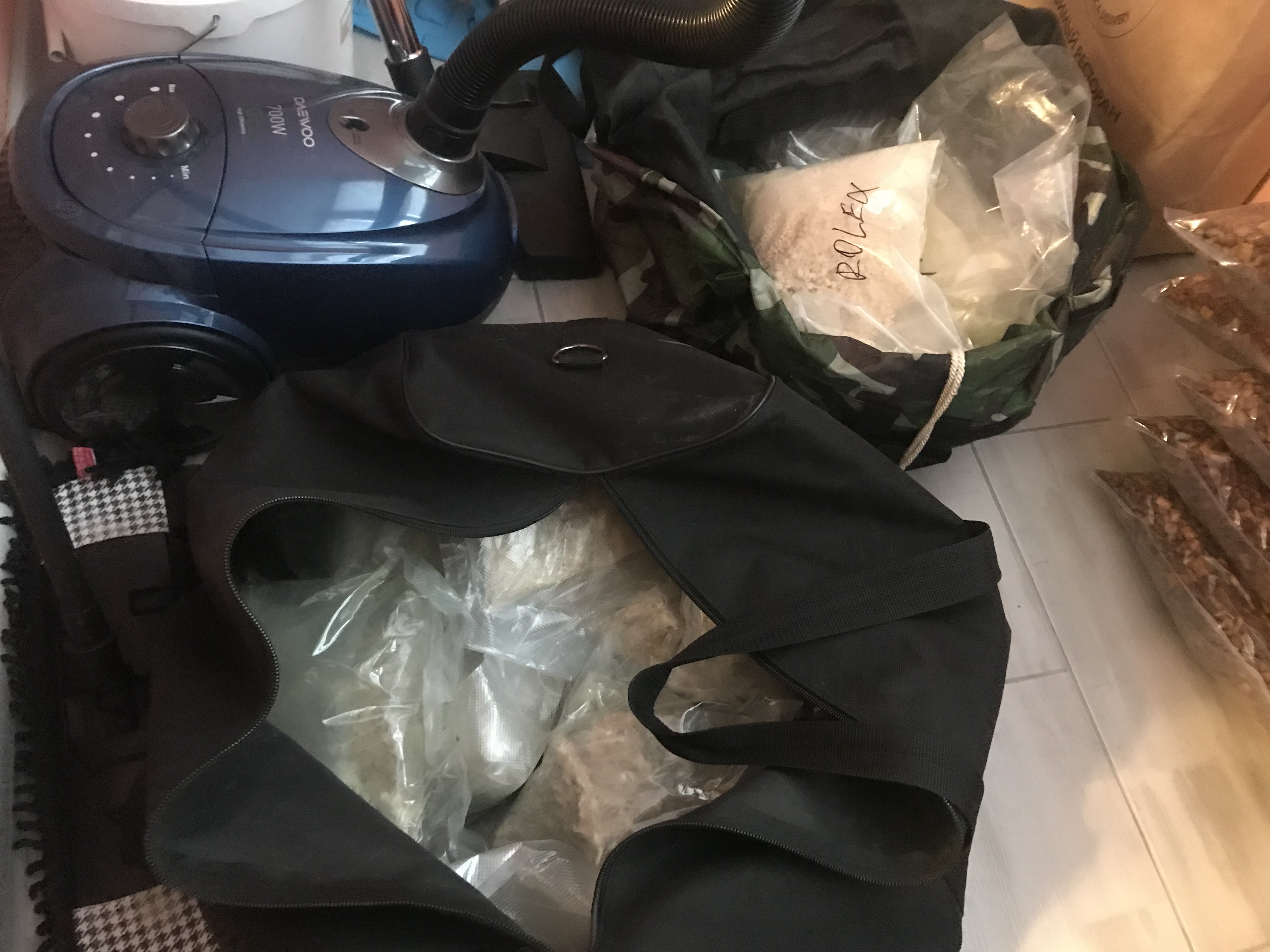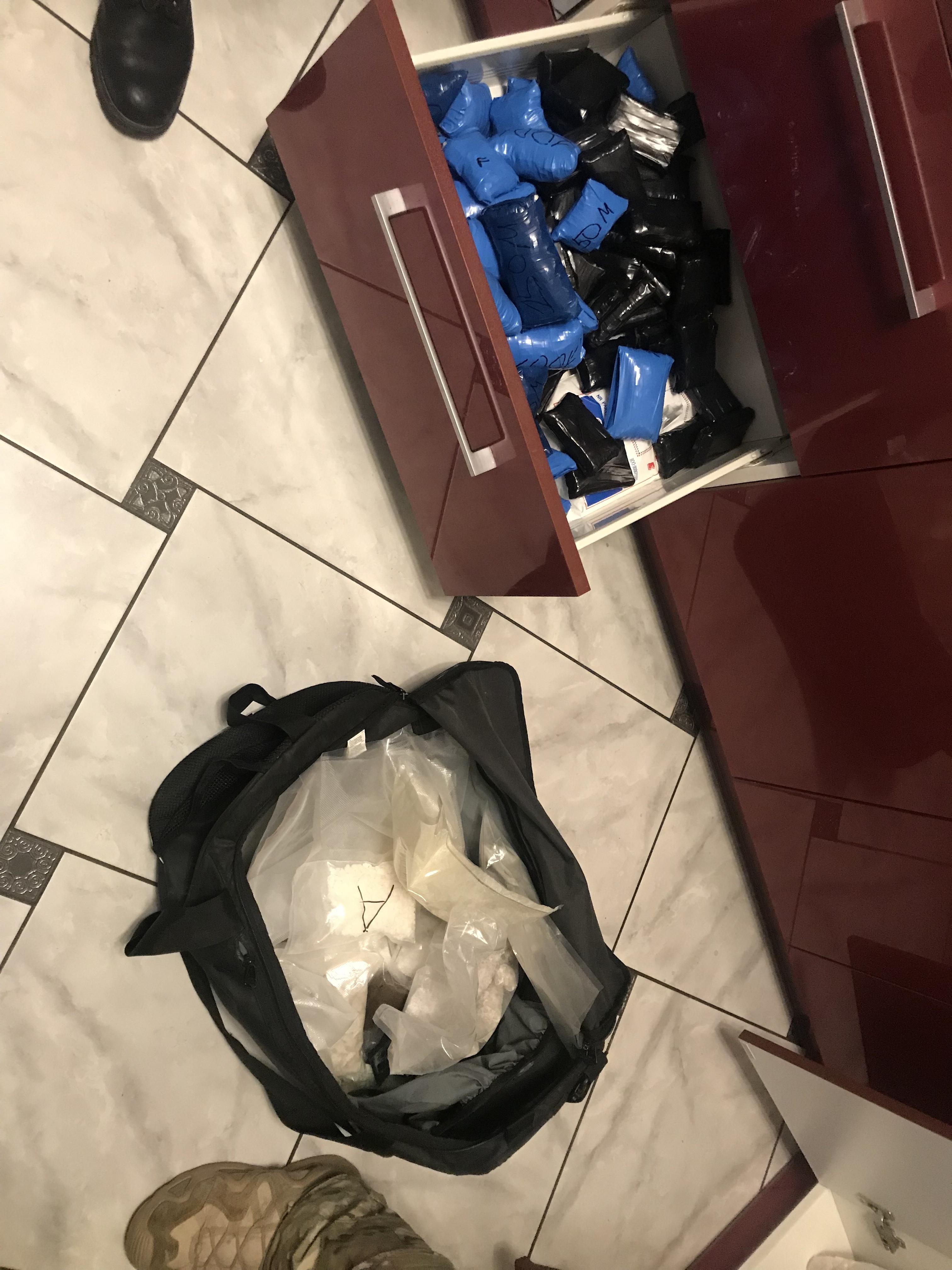 В ходе обыска места проживания подозреваемого обнаружены и изъяты наркотические средства и психотропные вещества: гашиш — более 21 кг, мефедрон — более 5 кг, МДМА — более 18 кг, героин — более 2 кг, амфетамин — более 4 кг и другие, общий вес которых составил более 56 кг. Кроме того, изъяты три единицы оружия и боеприпасы к ним.