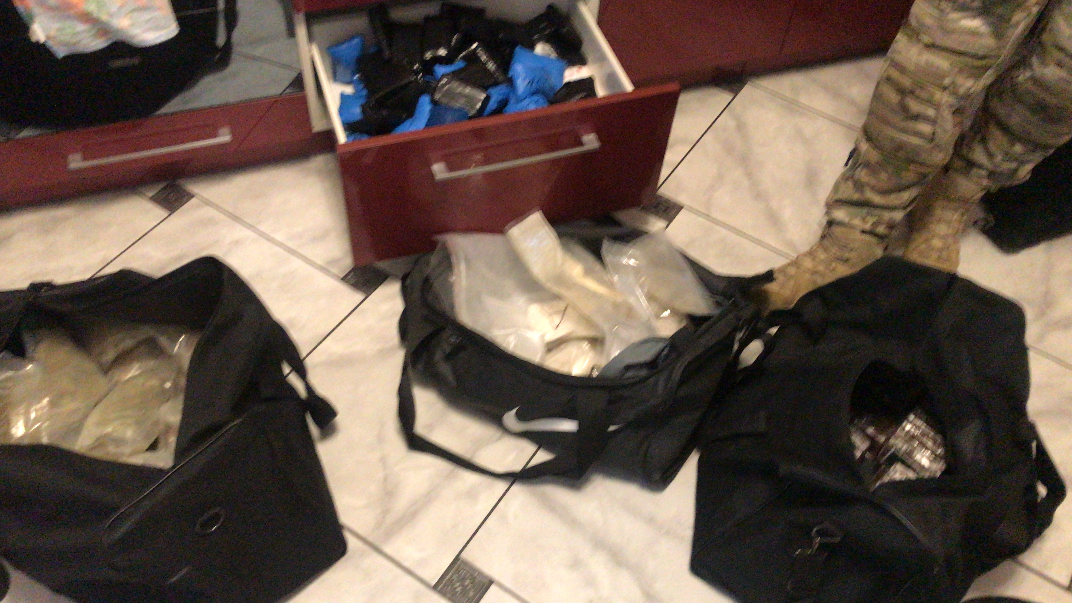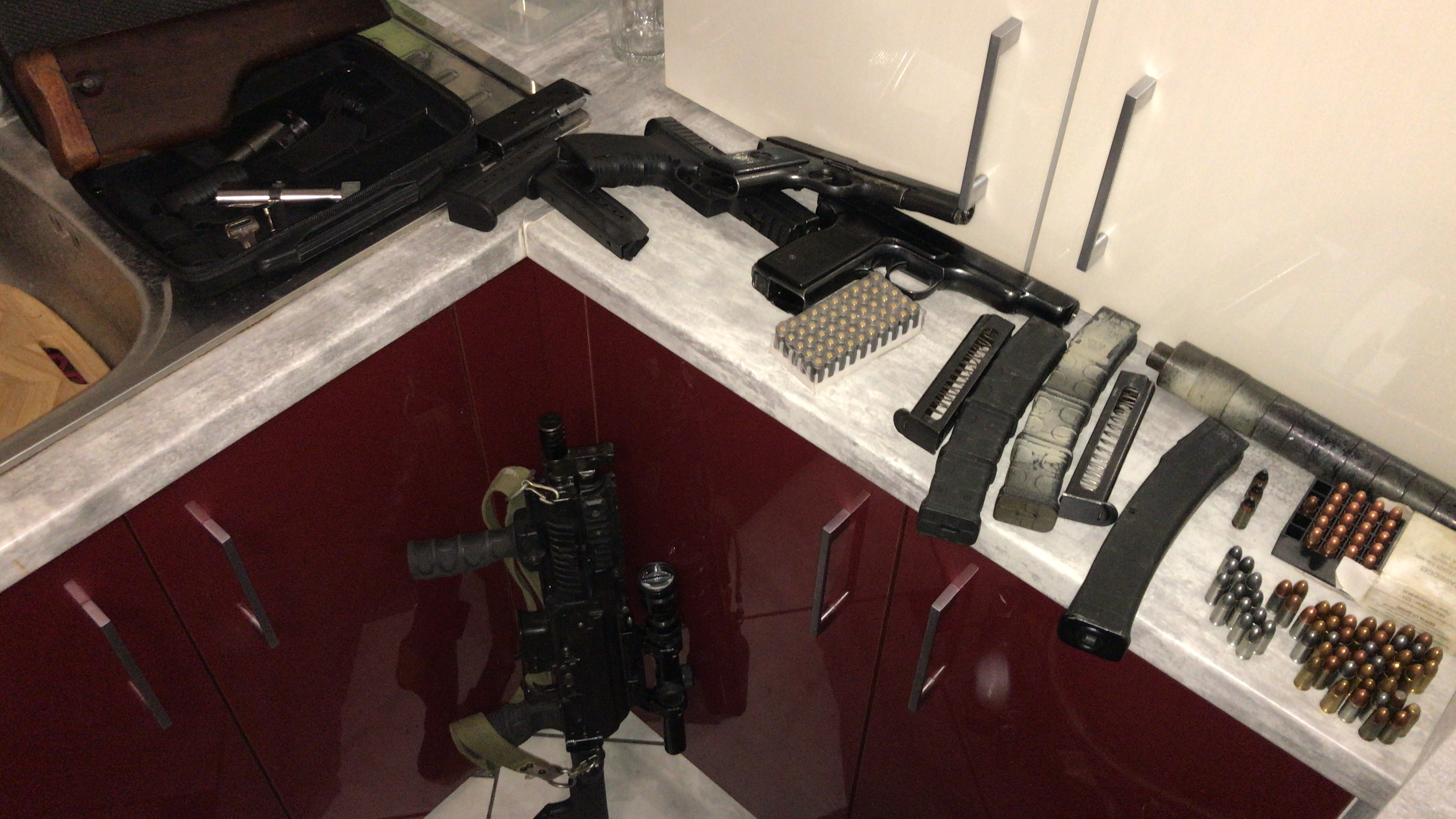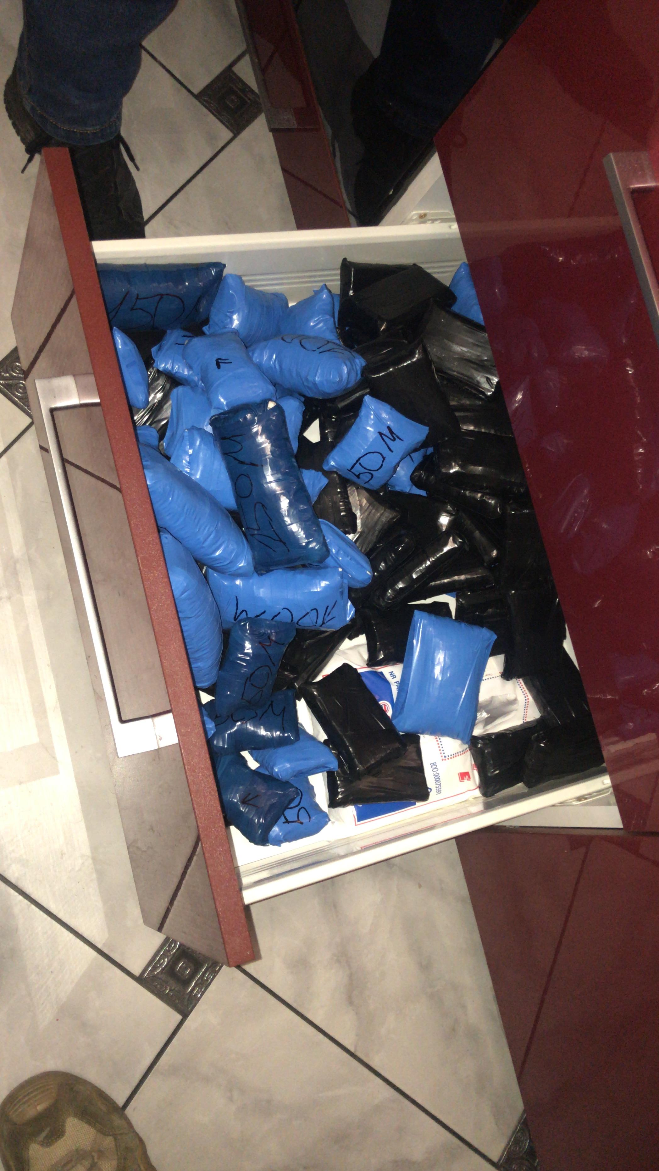 В ходе обыска места проживания подозреваемого обнаружены и изъяты наркотические средства и психотропные вещества: гашиш — более 21 кг, мефедрон — более 5 кг, МДМА — более 18 кг, героин — более 2 кг, амфетамин — более 4 кг и другие, общий вес которых составил более 56 кг. Кроме того, изъяты три единицы оружия и боеприпасы к ним.