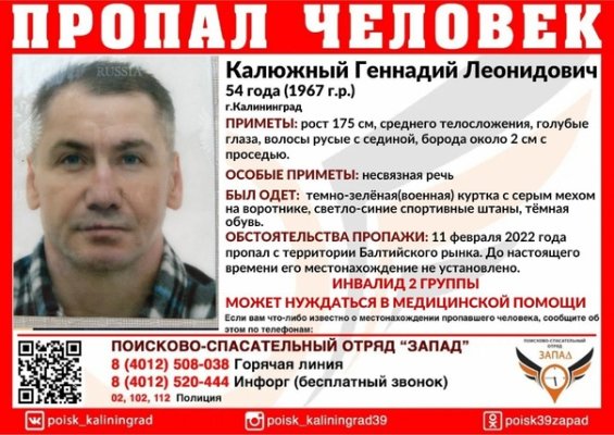 В Калининграде разыскивают 54-летнего Геннадия Калюжного, пропавшего два дня назад. Об этом сообщается на странице ПСО «Запад» в соцсети.