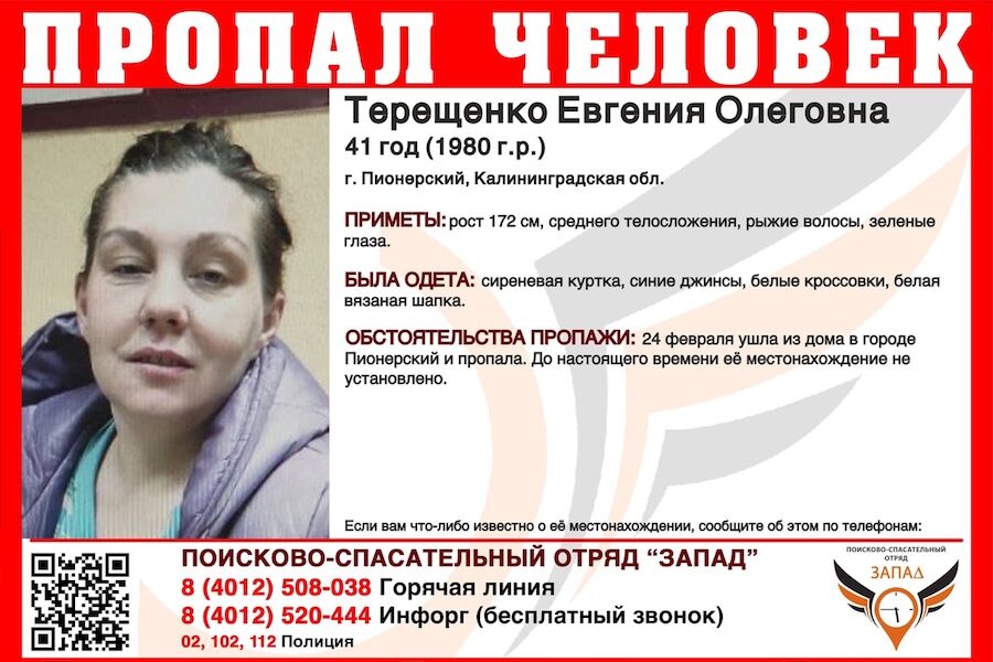 Женщина ушла из дома в Пионерском 24 февраля и с тех пор ее никто не видел. Приметы: рост 172 см., среднего телосложения, рыжие волосы, зеленые глаза. Была одета: сиреневая куртка, синие джинсы, белые кроссовки, белая вязаная шапка.