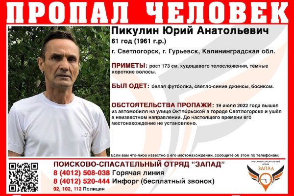 В Светлогорске разыскивается 61-летний Юрий Пикулин, пропавший два дня назад. Об этом корреспонденту «Нового Калининграда» в четверг, 21 июля, сообщили в ПСО «Запад».