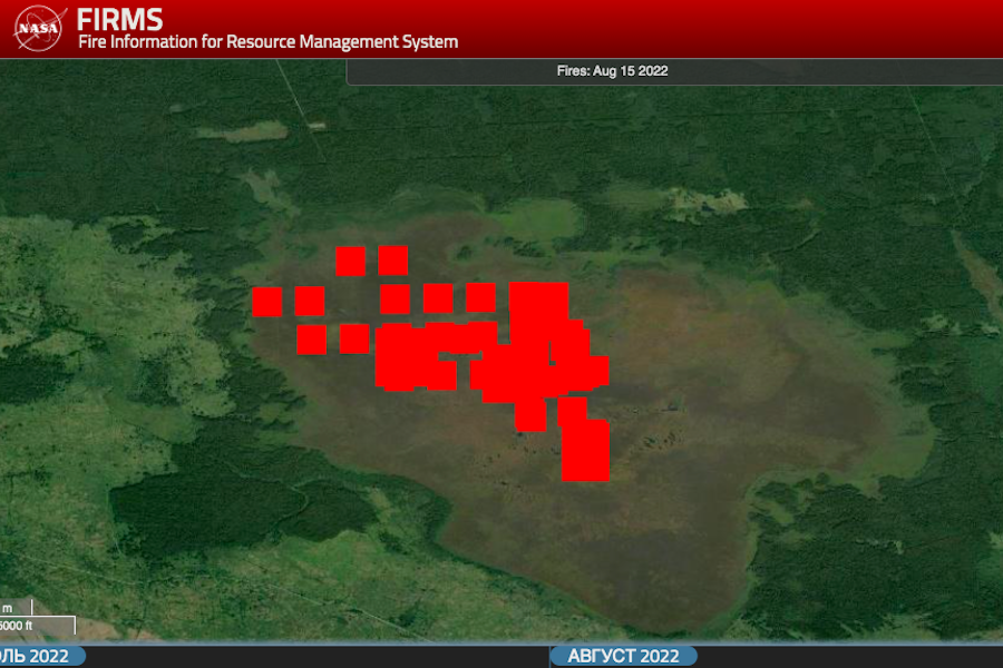 Согласно данным NASA (эту информацию подтверждают и российские сервисы, не предназначенные для коммерческого использования), во вторник, 16 августа, пожар практически прекратился, возгорание отмечалось только на одном участке с восточного края болота. Однако в среду, 17 августа, огонь снова начал распространяться.