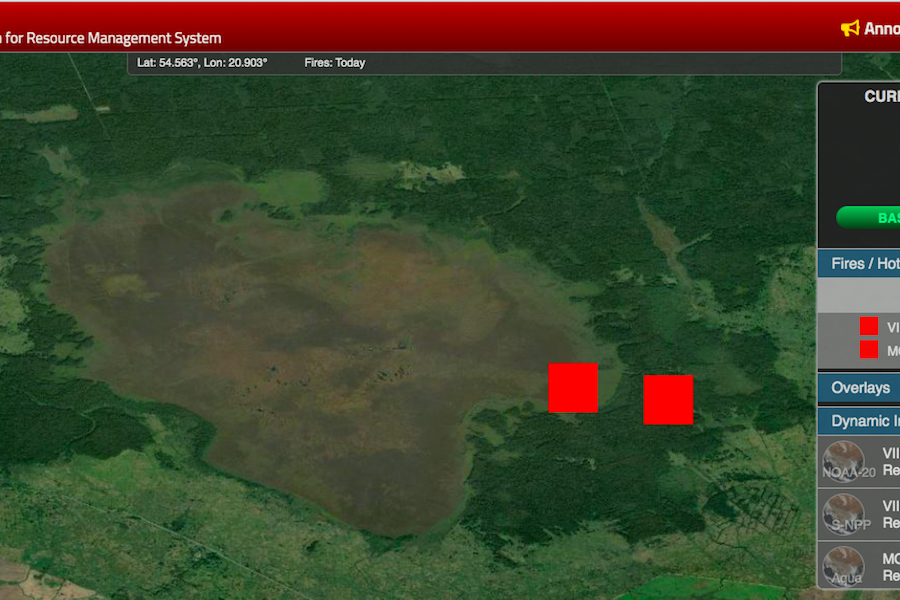 Пожар на верховом болоте Целау в Правдинском районе продолжается, хотя пик его пришелся на 15 августа. Об этом свидетельствуют данные разных сервисов по отслеживанию пожаров.