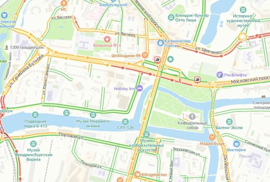 Авария произошла напротив Дома Советов. Участники ДТП заняли две из трех полос по направлению к выезду из города. По данным сервиса «Яндекс. Карты», длина пробки составила порядка 1 км.
