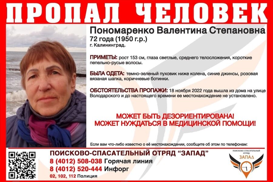 В Калининграде родственники, полиция и волонтеры разыскивают 72-летнюю Валентину Пономаренко, которая пропала накануне днем. Об этом в субботу, 19 ноября, сообщают волонтеры ПСО "Запад.