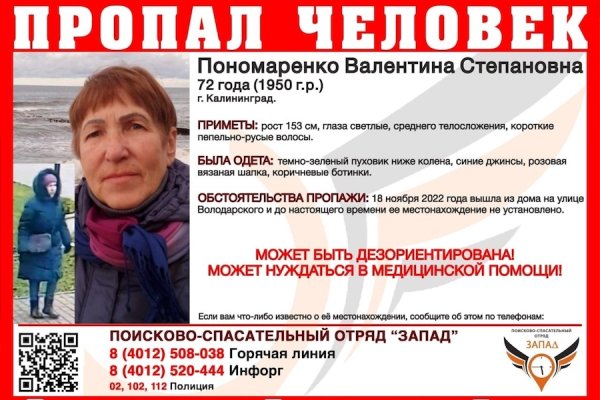 «На сегодняшний день сотрудниками полиции просмотрено множество камер „Безопасного города“ и не только. Полиция совместно с волонтёрами ведет непрерывную работу по поиску пропавшей, но нам не хватает свидетельств. Мы обращаемся к жителям Калининграда с просьбой о помощи! Присмотритесь к фотографии пропавшей ещё раз. Возможно, именно Вы видели где-то Валентину Степановну и сможете помочь нам её найти», — говорится в сообщении поискового отряда.