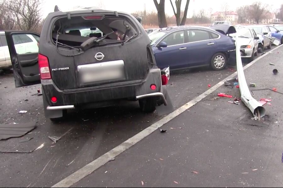 Авария произошла сегодня в 10.05. Внедорожник «Ниссан» снес фонарный столб и протаранил автомобили «Киа», «Ниссан», «Лада», «Шкода» и «Киа», припаркованные вдоль проезжей части. Нетрезвый водитель «Ниссана» получил травмы.