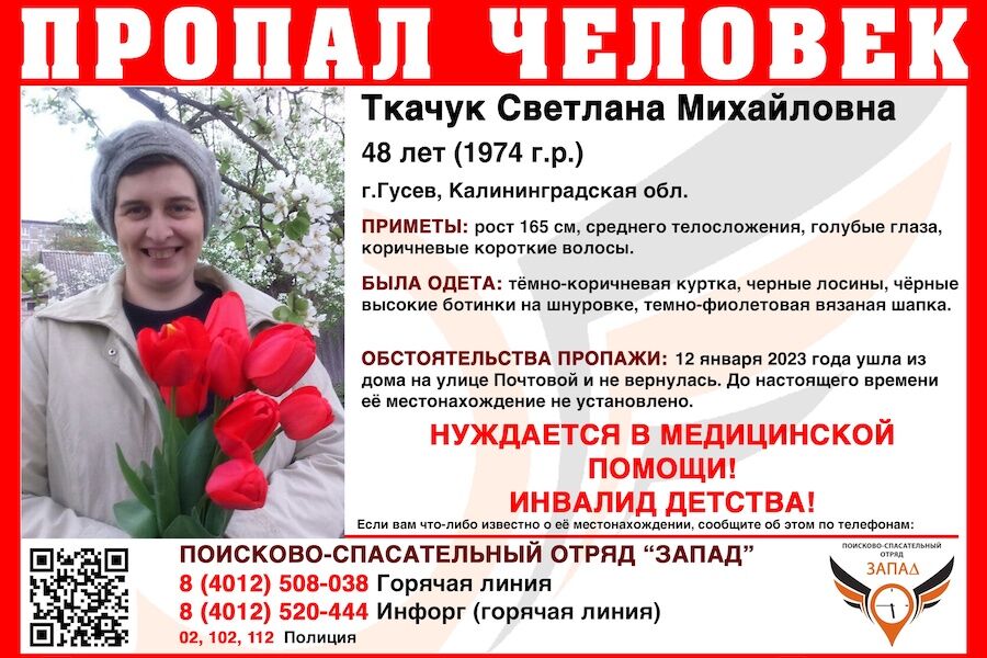 В Гусеве родственники, полиция и волонтеры разыскивают 48-летнюю Светлану Ткачук, которая пропала накануне. Об этом корреспонденту «Нового Калининграда» в пятницу, 13 января, сообщили в ПСО «Запад».