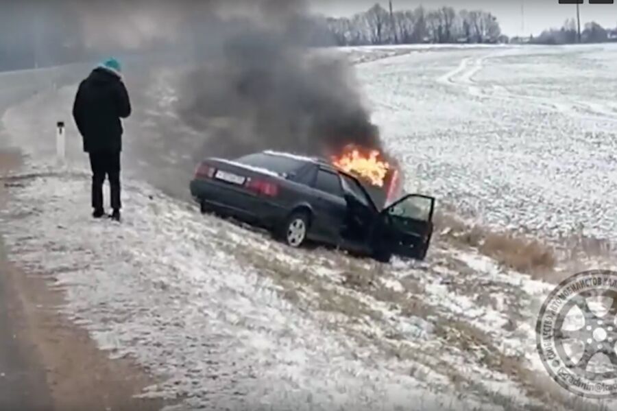 В сообществе автомобилистов Калининградской области появилось видео последствий ДТП под Гусевом, где столкнулись «Ауди» и грузовик «Мерседес». В результате столкновения легковушка скатилась в кювет и загорелась.