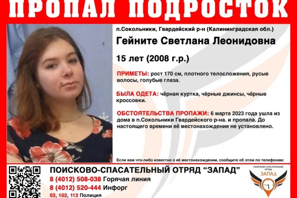 В Калининградской области разыскивается девочка-подросток, пропавшая два дня назад. 15-летняя Светлана Гейните ушла из дома в пос. Сокольники Гвардейского округа, сообщает Поисково-спасательный отряд «Запад» в соцсетях.